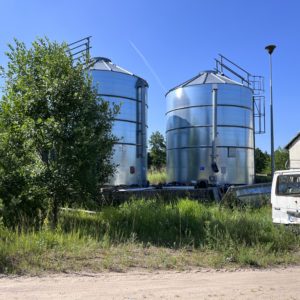 – obok stajni znajdują się dwa zbiorniki stalowe na zboże pionowe typu BIN po 60 t każdy, na fundamencie żelbetowym