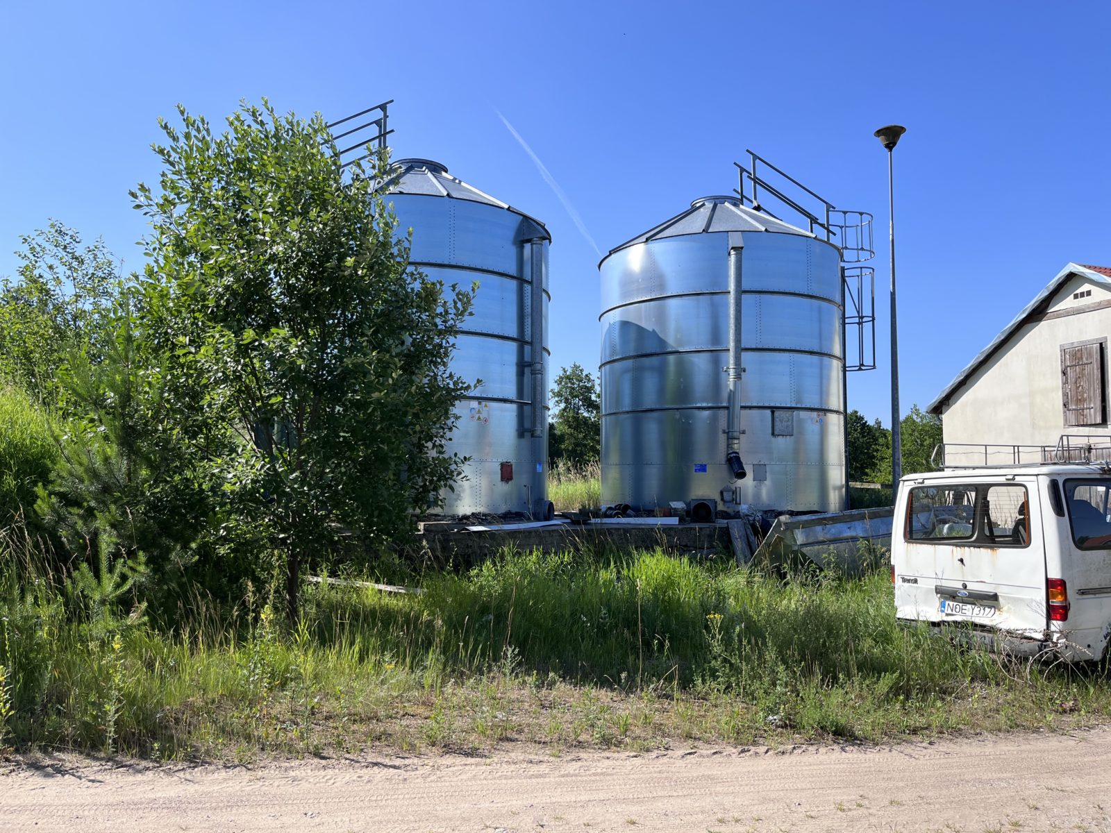 – obok stajni znajdują się dwa zbiorniki stalowe na zboże pionowe typu BIN po 60 t każdy, na fundamencie żelbetowym